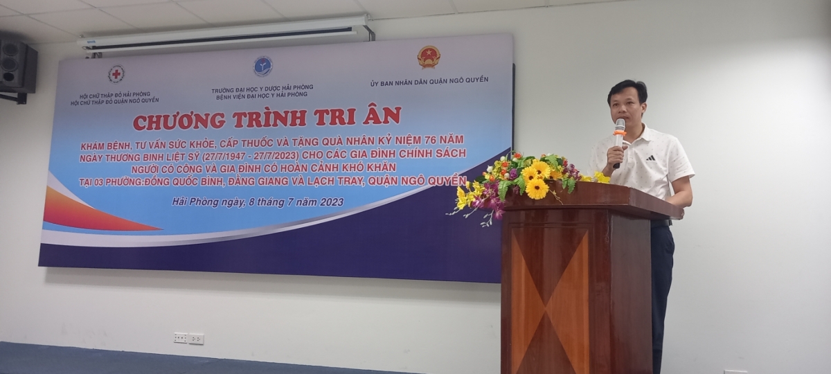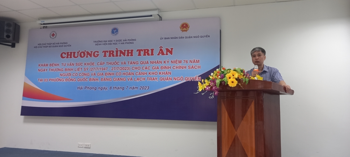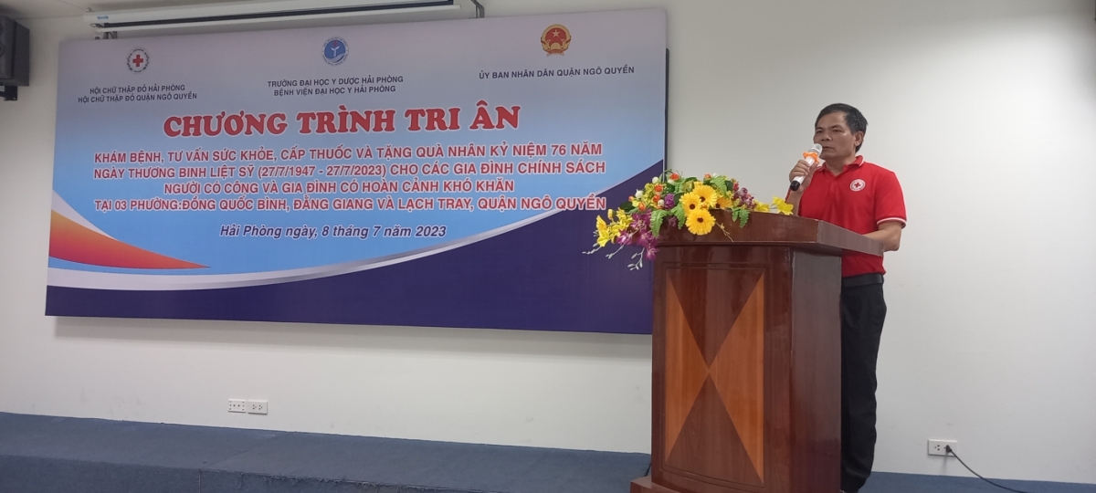 Tiếp tục Chương trình khám bệnh, tư vấn sức khỏe, cấp thuốc miễn phí và tặng quà các gia đình chính sách, người có công, người có hoàn cảnh khó khăn năm 2023, sáng 8/7/2023 tại Bệnh viện Đại học Y Hải Phòng, Hội Chữ thập đỏ thành phố phối hợp Bệnh viện Đại học Y Hải Phòng tổ chức Chương trình khám bệnh, tư vấn sức khỏe, cấp thuốc miễn phí và tặng quà các gia đình chính sách, người có công, người có hoàn cảnh khó khăn thuộc 3 phường: Lạch Tray, Đổng Quốc Bình, Đằng Giang (quận Ngô Quyền).