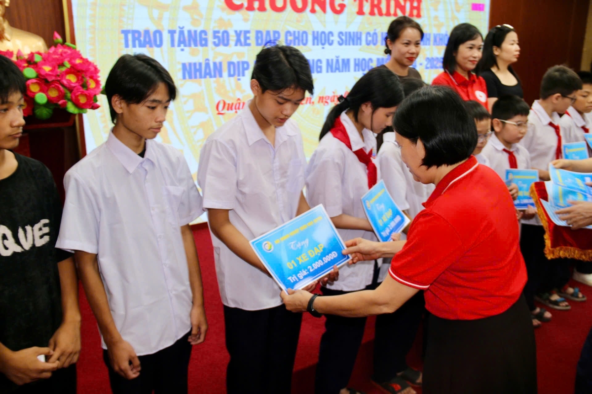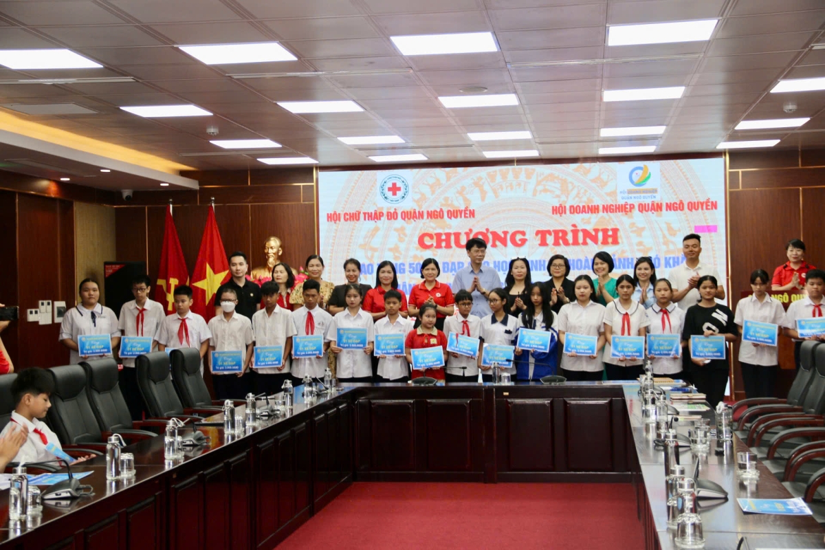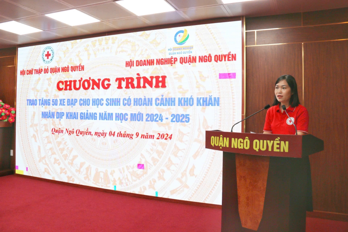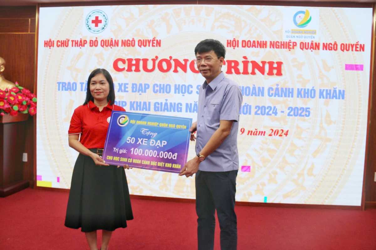 Tại Chương trình Hội Chữ thập đỏ quận Ngô Quyền cùng nhà tài trợ trao tặng 50 chiếc xe đạp cho 50 em học sinh có hoàn cảnh khó khăn, trị giá 100 triệu đồng. Đây là hoạt động có ý nghĩa thiết thực giúp các em học sinh có hoàn cảnh khó khăn, trẻ mồ côi, gia đình chính sách có thành tích trong học tập đón chào khai giảng năm học mới 2024 - 2025.