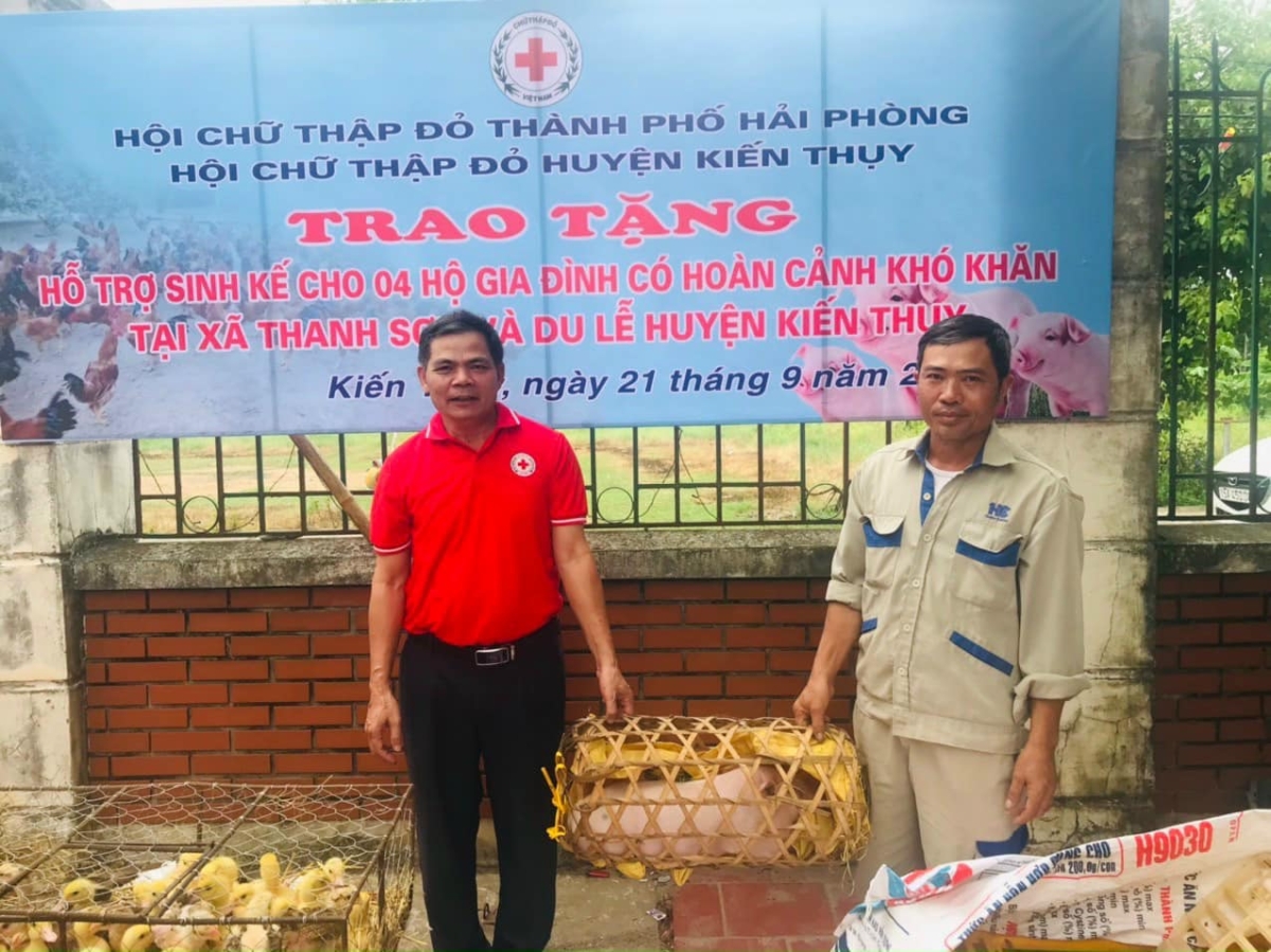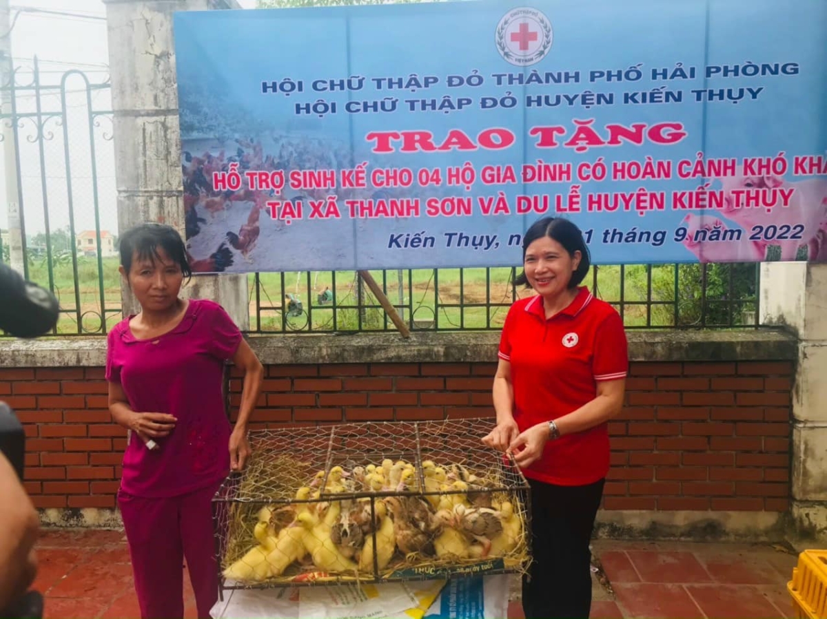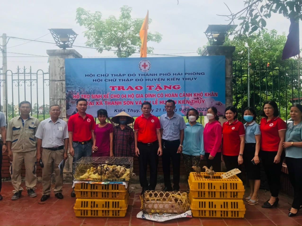 Bốn hộ nhận được tổng số 140 con gà, 01 con lợn và 30 con ngan với trị giá 10 triệu đồng, trong đó Hội Chữ thập đỏ thành phố hỗ trợ 8,75 triệu đồng, số còn lại do Hội Chữ thập đỏ huyện Kiến Thuỵ tặng.