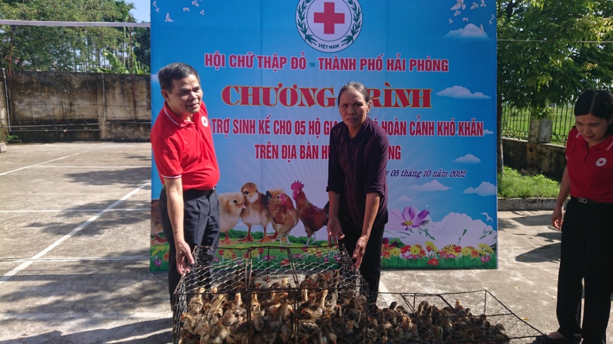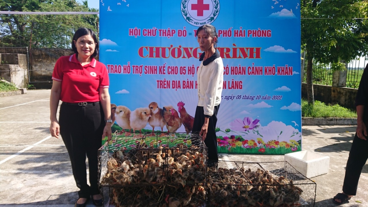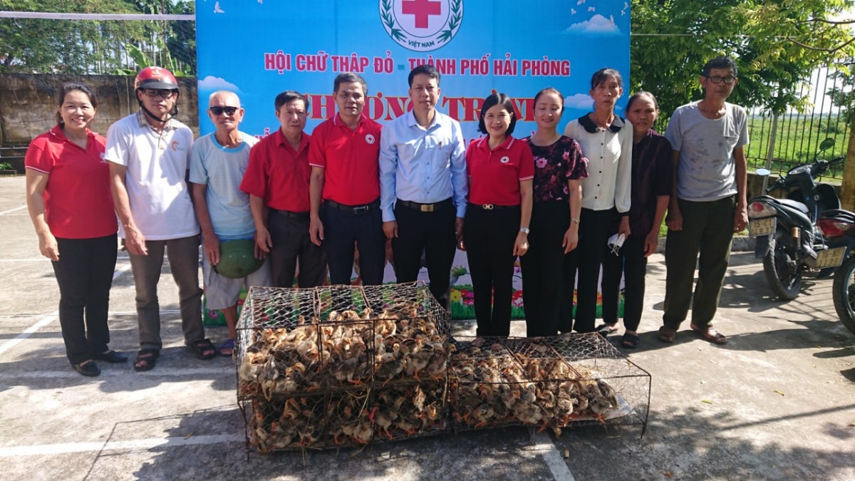 Tại đây, Hội Chữ thập đỏ thành phố đã trao tặng 280 con gà giống cho 05 hộ dân thuộc diện hộ nghèo, cận nghèo, khó khăn của các xã Hùng Thắng, Quyết Tiến và Tiên Cường của huyện Tiên Lãng. Tổng số trị nhân đạo trên 11 triệu đồng.