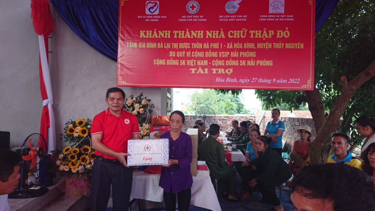 Chiều ngày, 27/9, Hội Chữ thập đỏ thành phố Hải Phòng tổ chức khánh thành Nhà Chữ thập đỏ cho gia đình bà Lại Thị Được – Thôn Hà Phú 1, xã Hòa Bình, huyện Thủy Nguyên do Qũy Vì cộng đồng VSIP Hải Phòng và một số đơn vị tài trợ. Dự Chương trình có ông Đào Trọng Trung – Chủ tịch Hội Chữ thập đỏ thành phố, Thường trực Hội Chữ thập đỏ thành phố, huyện, xã, các nhà tài trợ và chính quyền, đoàn thể địa phương.