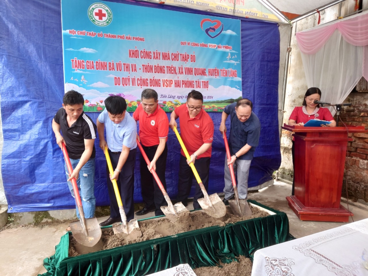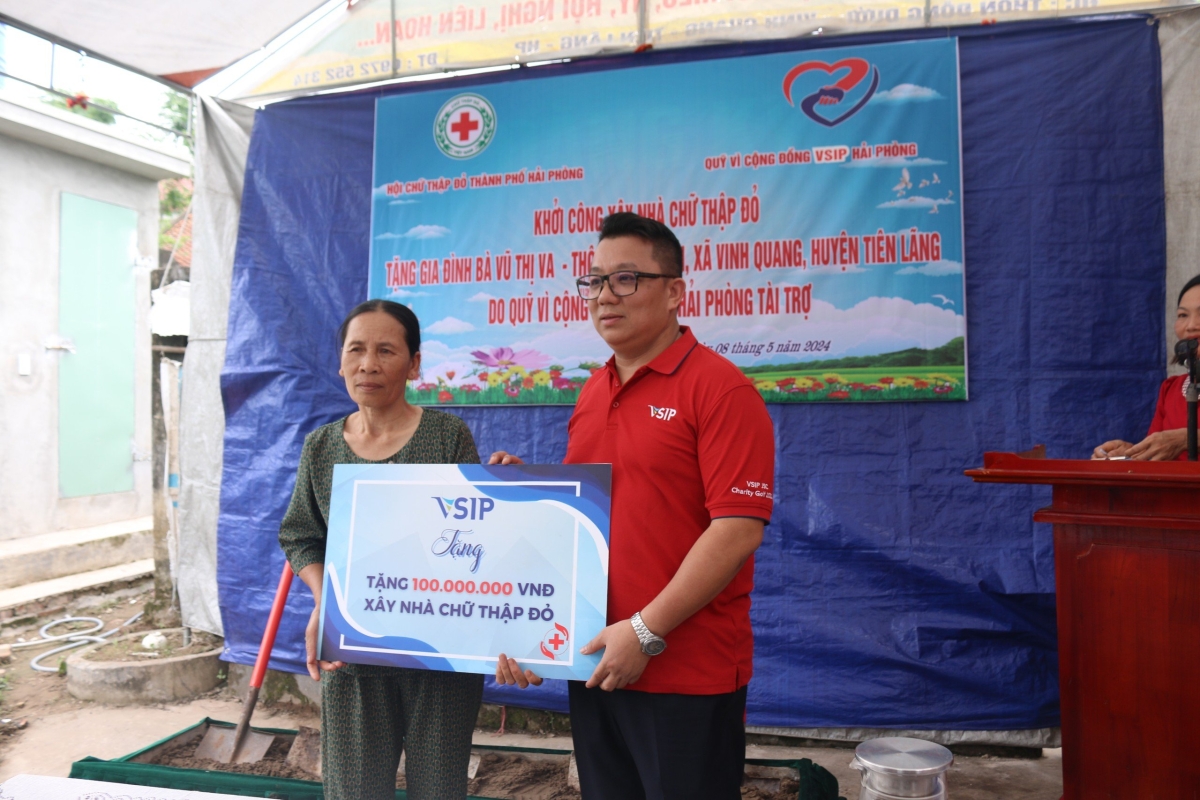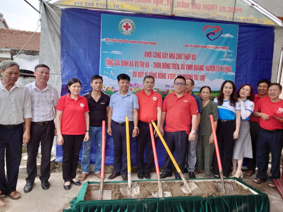 Tại xã Vinh Quang, Hội Chữ thập đỏ thành phố và Qũy Vì cộng đồng VSIP Hải Phòng đã trao tặng 100 triệu đồng cho gia đình bà Vũ Thị Va xây nhà Chữ thập đỏ. Gia đình bà Va thuộc hộ cận nghèo, bà sống một mình, không có chồng, ốm yếu, bệnh tật, có 1 con trai 42 tuổi, bị bệnh về mắt không đi làm được, con dâu bỏ đi để lại cháu nội hiện đang là học sinh lớp 1. Gia đình hiện đang ở trong căn nhà cấp 4 cũ, xuống cấp nghiêm trọng, không đảm bảo an toàn trong mùa mưa bão.